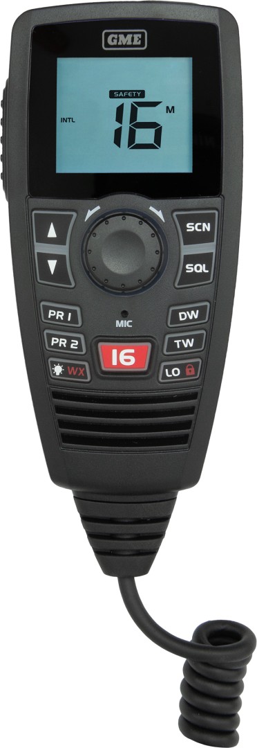 The GME GX750 is a compact, modular "black box" VHF marine radio designed for vessels with limited dash space, featuring a waterproof (IPX7) LCD controller microphone