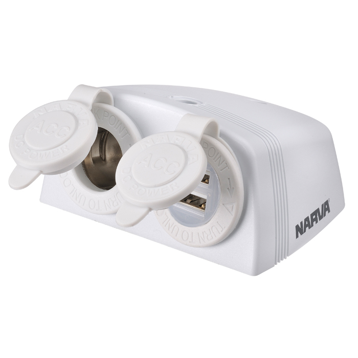 This extremely practical and convenient surface mounted panel features two USB sockets to provide convenient charging points while the cigarette plug socket provides convenient point for items such as spot lights. Accessory socket 20A @ 12V, 10A @ 24V. USB outlets 5V, 2.5A.