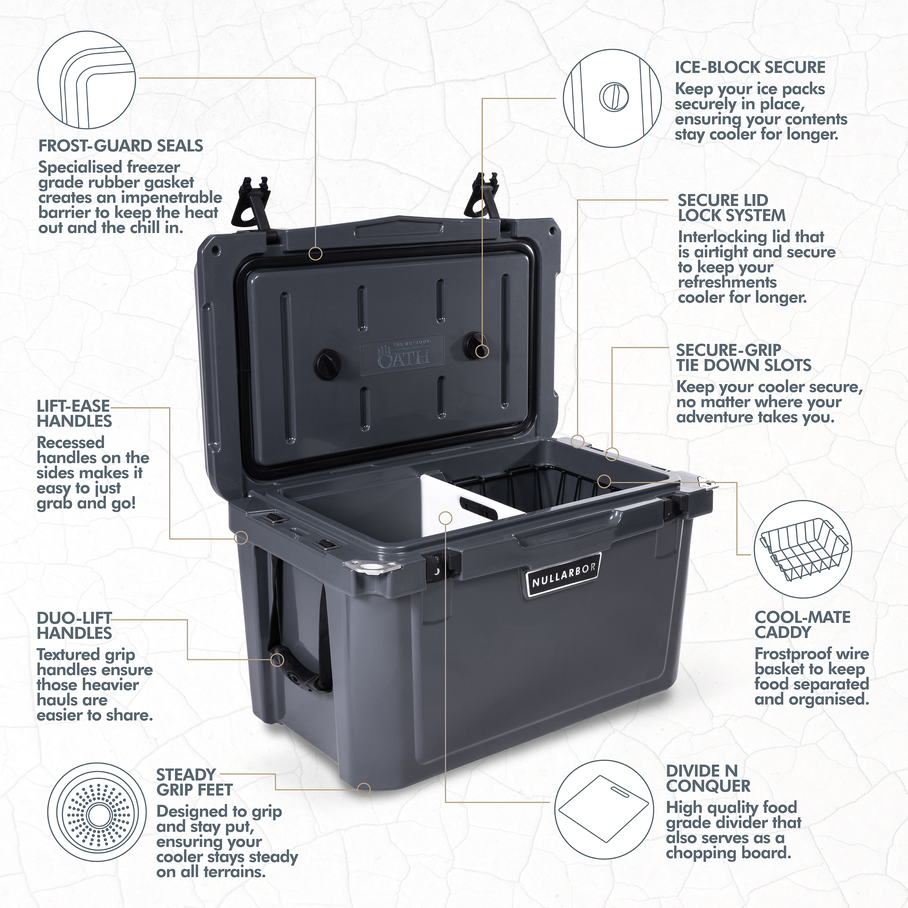 Whether you're embarking on an Outback expedition, out fishing or simply enjoying a day with some mates, the Nullarbor cooler range is here to ensure your refreshments stay icy cold. Features