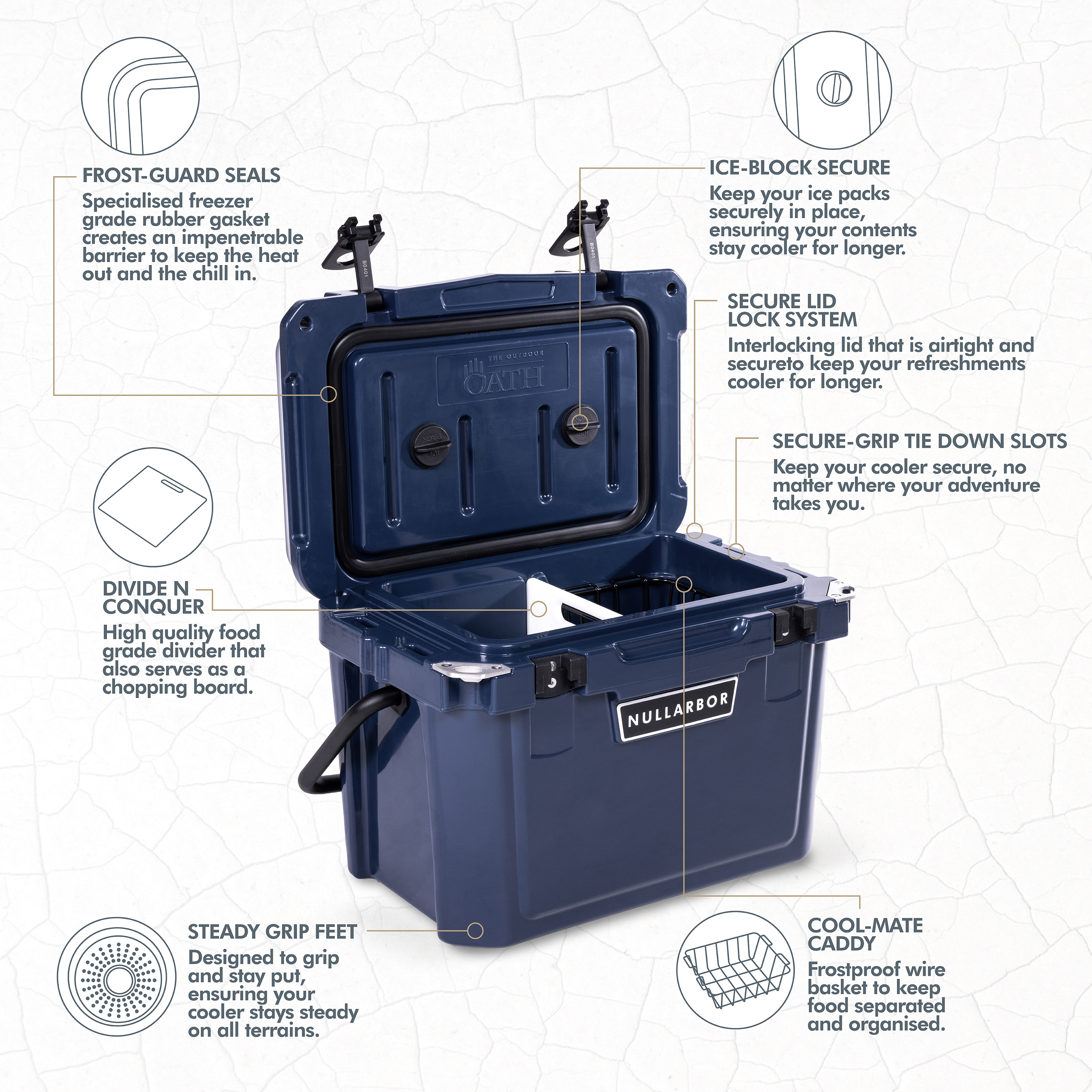 Steady Grip Feet - Designed to grip and stay put, ensuring your cooler stays steady on all terrains.