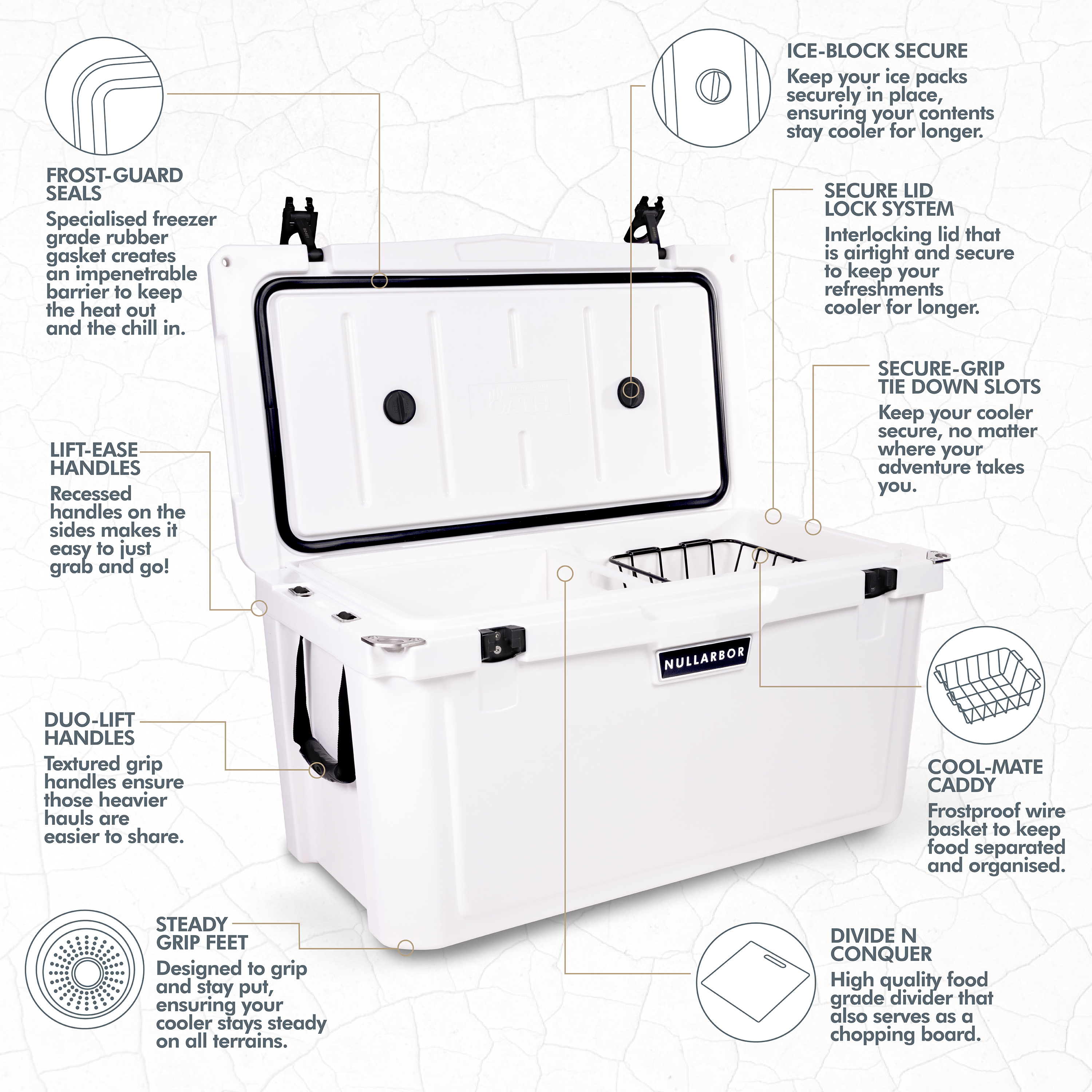 Whether you're embarking on an Outback expedition, out fishing or simply enjoying a day with some mates, the Nullarbor cooler range is here to ensure your refreshments stay icy cold. Features
